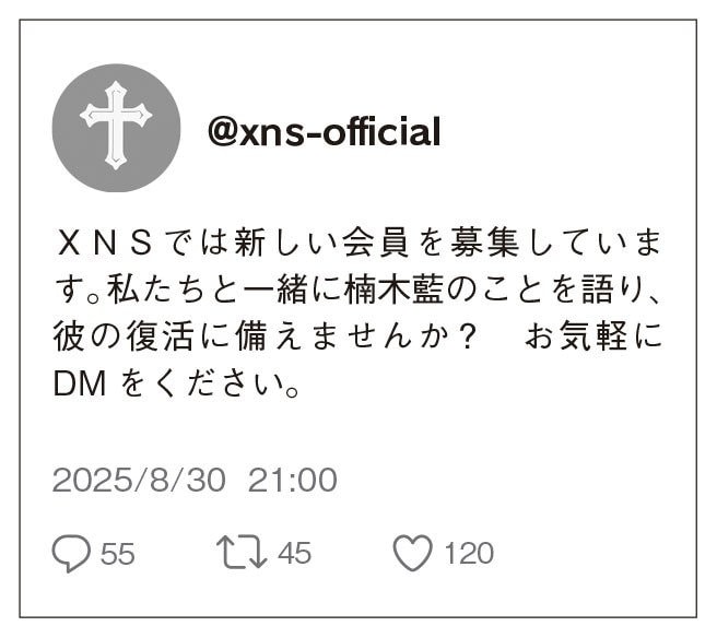 「最近、〈XNS〉を復活させたんです。藍について考え、藍のことだけを話す会合です。同じ名前のグループがふたつあるのは、混乱のもとです。メンバーからも困惑の声が上がっています」