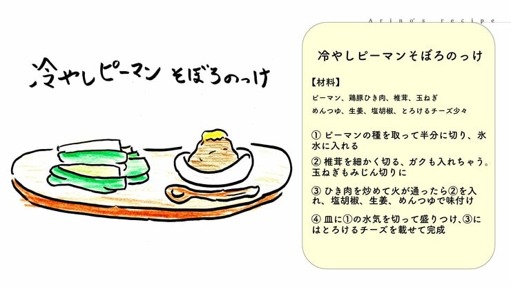 と、それまでみんなは想像もしてへんかったけど、“ガリのマリネが目の前にあるおかげで、想像してみたら美味しそう”となる。そんなお店のメニューで1番盛り上がったのが、『冷やしピーマンのそぼろのっけ』。