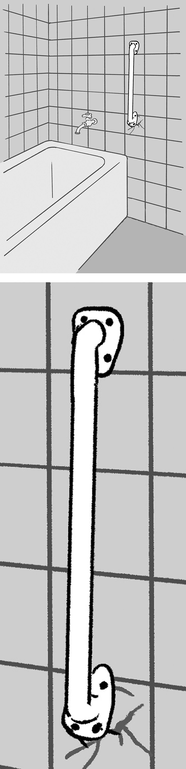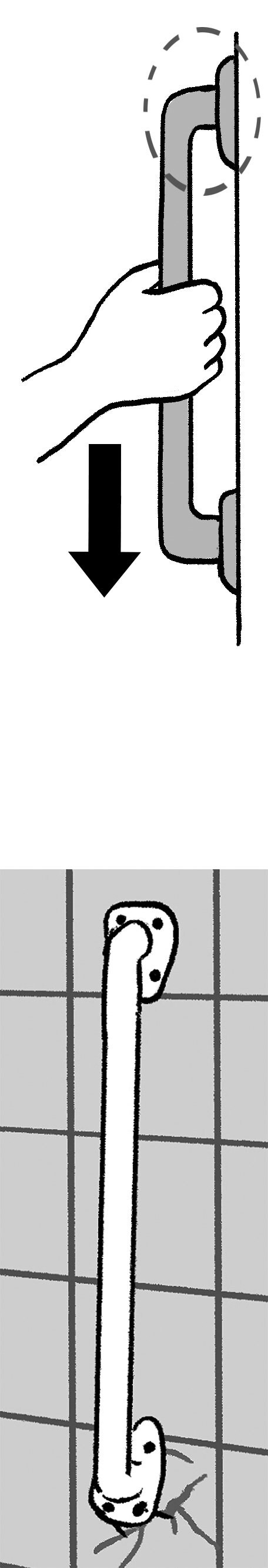「縦型の手すりは構造上、上から下に引っ張られることが多いため、上部に負荷がかかりやすい。しかし浴室の手すりは、下の留め具が壊れていた。下部に負荷がかかるような手すりの使い方はあまり一般的ではありません。もしあるとすれば……」