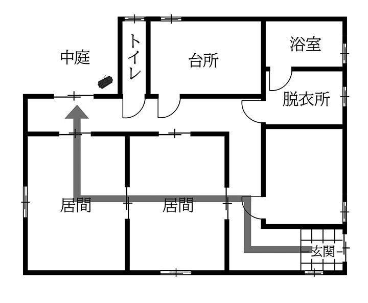二人は玄関から二つ続きの居間を抜け、廊下へ出た。ガラス戸の向こうには小さな庭が見える。その隅に、何か黒いものが置いてある。