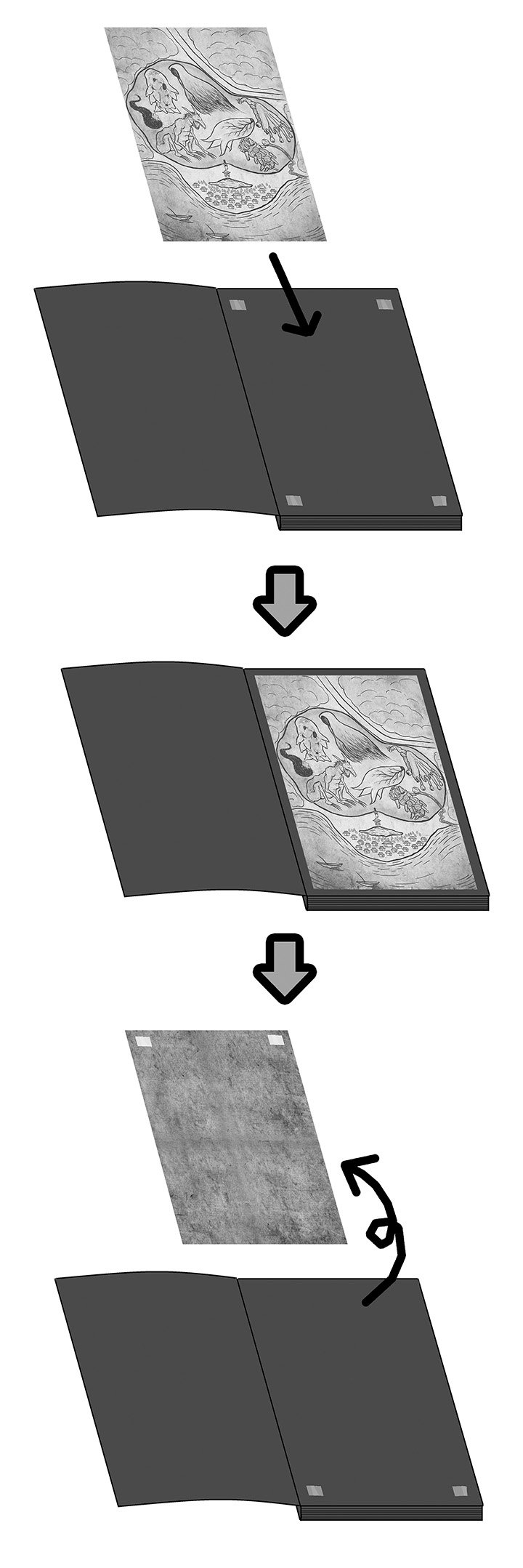 祖母は、ノートの1ページ目に古地図を貼り付けていた。だが、燃やす前に剥がしたのだ。その際、上のテープ2枚が古地図に、下の2枚がノートに残ったのだろう。