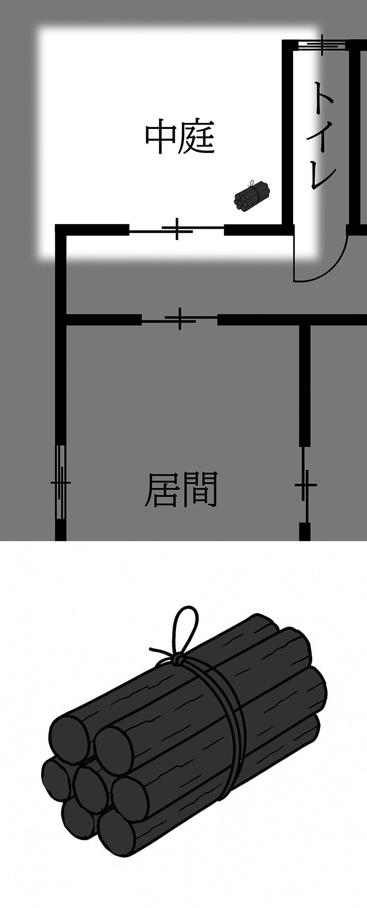 庭の隅に置かれていた、炭になった木。誰かが庭で焚火をして、ノートを燃やしたのだろうか。しかし、なぜ?