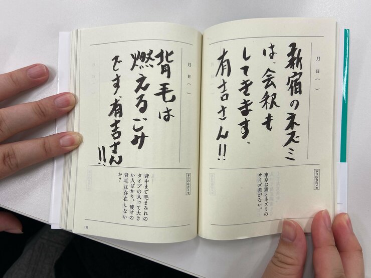 滝沢:有吉さんのメモが「東京は猫とネズミのサイズ差がない。」だったので、僕は「新宿のネズミは会釈もしてきます、有吉さん‼」に。その次のページでは有吉さんが「背中まで毛まみれのタイプんも人って大きい人ばかり。痩せの背毛は存在しないのか?」だったので、僕は「背毛は燃えるゴミです、有吉さん‼」といった具合に。