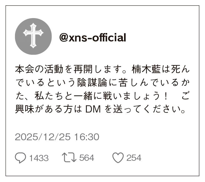 藍は生きている。いつか私たちの前に帰ってくる。〈XNS〉で祈りを捧げていたころは本心から信じられていたその説が、いまは私の中で少しずつ色褪せている。藍はもしかして、本当に死んでいるのではないか。警察は本当のことを発表しているのではないか。そんな陰謀論が、徐々に私を侵食している。