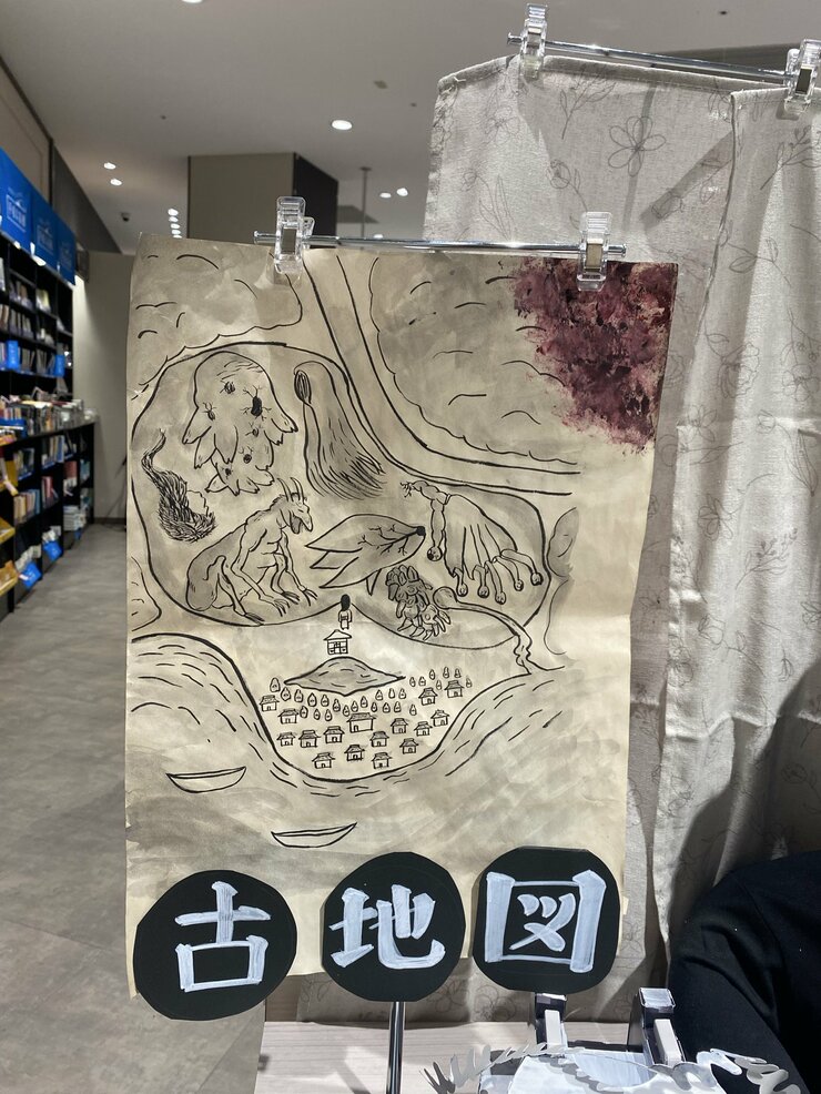 見所としましては、雨穴さんの部屋の再現と、実際にお話の中にあったように、紅茶で浸した古地図を作ったことです。