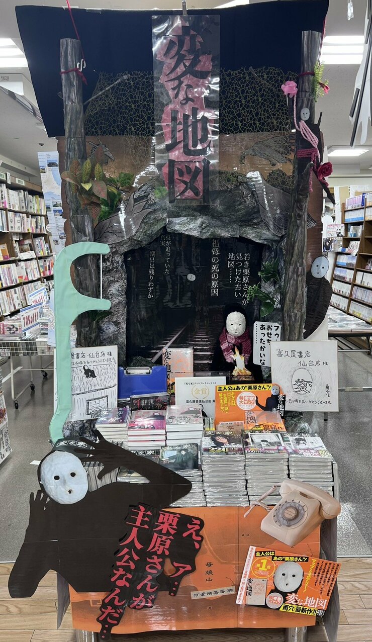 いつも芸術的な売り場を作ってくださる仙台店様ですが、今回はいつにもましてホラーな世界観です。個人的に、雨穴を柱に縛り付ける紐の色がすごいなと思いました。これが緑色であれば「巨大植物の茎に絡まってしまったのかな」という、ほのぼのした解釈もできますが、花と同じ色である時点で植物ではないことが明確になってしまいます。人工的な何か…作為的な何か…深く考えないほうがよさそうです。あと、細かい点ですが「え、ア…」に感動しました。私のことをよく理解してくださっている……。