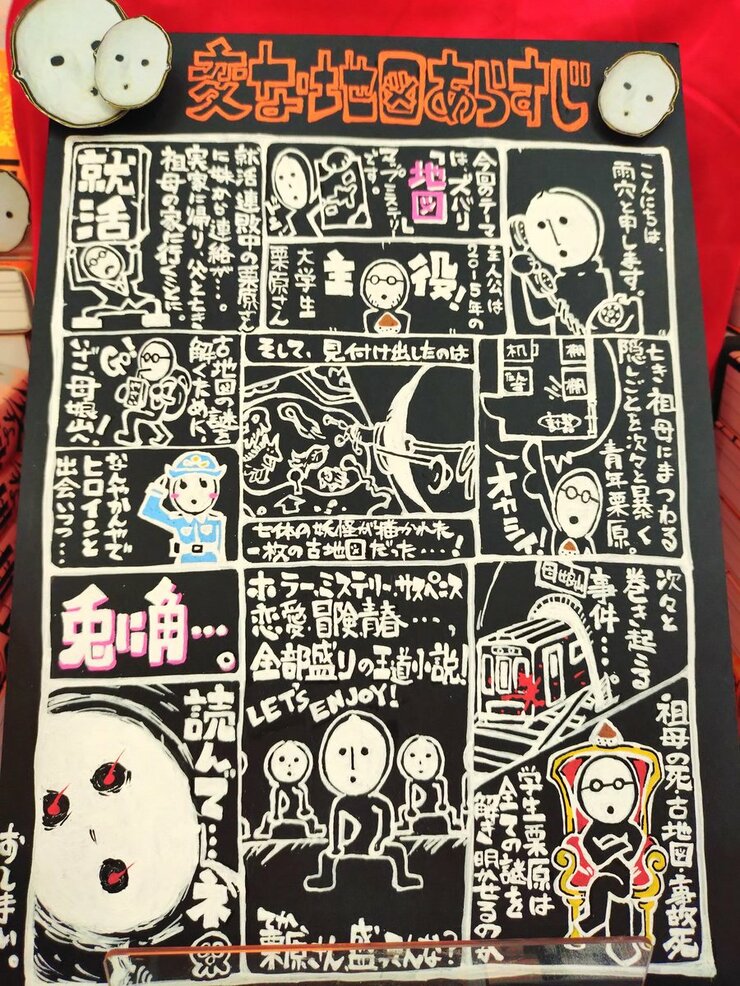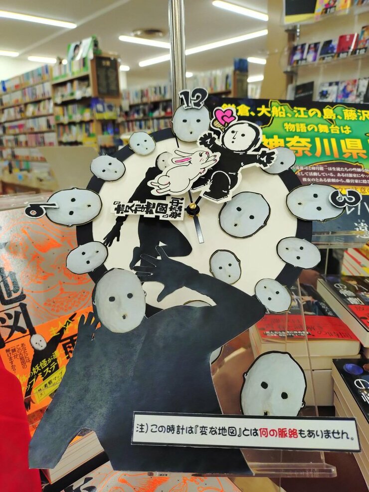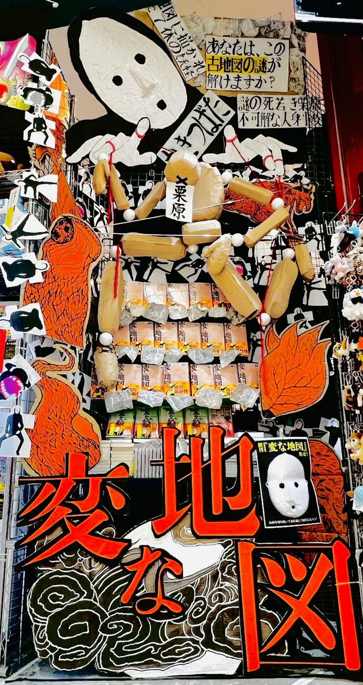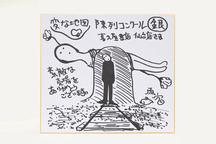 これは相当おしゃれですね。「変な地図」は、トンネルに隠された秘密を、地図を通して解明する物語ですが、それがこのシンプルな飾りによって抽象的に表現されている…! と勝手に感動してしまいました。地図の向こうにぼんやり見えるのが誰なのか、作者の私ですらわかりません。すごく深い売り場だと思います。