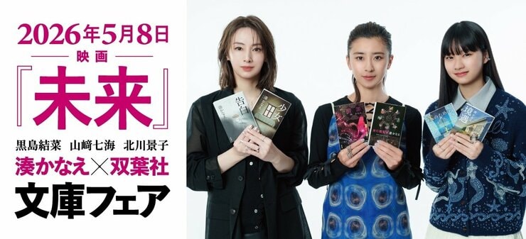 また、『未来』の映画化を記念した「湊かなえ×双葉文庫フェア」の開催も決定。黒島結菜、山﨑七海、北川景子の主要キャスト3名の撮りおろし写真を使用した、今回限りの特別帯で店頭を盛り上げる。