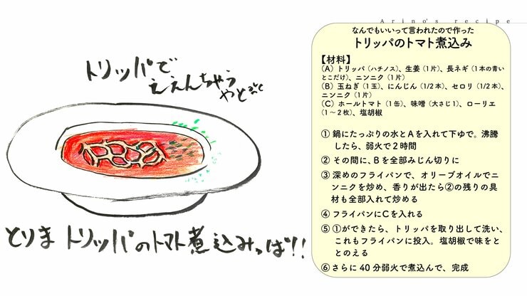 分かった、と言って作ってやったのが「トリッパのトマト煮込み」です。牛の胃袋をトマトと一緒にじっくり煮込んだイタリア料理。調理時間は、5時間くらい。キッチンでおいしそうな匂いがしてくると、ひょっこり顔を出す妻。