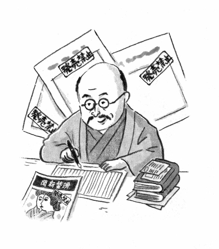 だが、その勢いは長くは続かなかった。創刊から2年、28号に載せた「頓智研法発布式之図」が不敬に問われる。大日本帝国憲法発布式をもじり、玉座の上に骸骨を置いたこの挿絵には、自らの名を重ねた外骨らしい諧謔もうかがえる。だが、その洒落は許されず、天皇を想起させる表現が問題視されたのだ。外骨はこの一件で3年8カ月に及ぶ獄中生活に入り、その獄中で、のちに博報堂を創業する瀬木博尚と出会い、生涯にわたる親交を結んだ。
