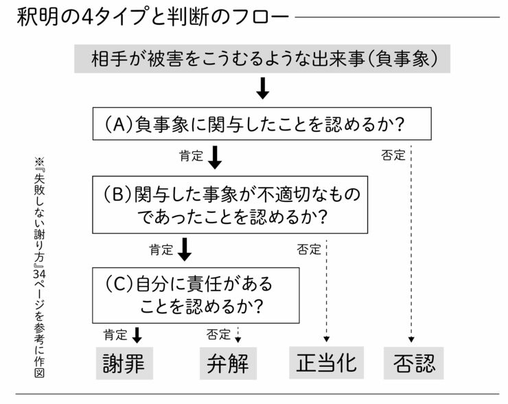 失敗や間違い、理不尽やルール違反など、相手が被害をこうむるような出来事を「負事象」と呼ぶそうですが、これらの釈明行為は「(A)負事象への関与」「(B)行為の不当性」「(C)行為に対する責任」という3要素によって区別されます。その判断のフローを示したのが上の図です。